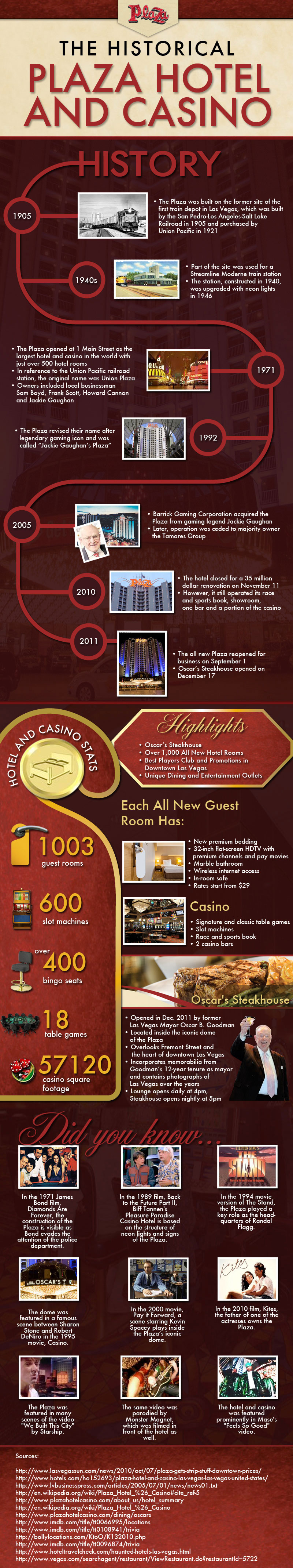 Before the giant casinos that now line Las Vegas Boulevard, there were the classics like The Plaza that established Vegas as the city of glitz, glamour and gaming – one of the original Las Vegas celebrity haunts. The Plaza, located at #1 Main Street is a historical icon for downtown Las Vegas. The Plaza Hotel & Casino is also the gateway to the famous Fremont Street Experience. When the Plaza opened its doors in 1971 it was the largest hotel and casino in the world with over 500 rooms. Over the last 40 years, the Plaza has been featured in several motion pictures and influenced the design and shape of Sin City’s skyline. Learn more about the history of the iconic Plaza Hotel and Casino in downtown Las Vegas in this Infographic.