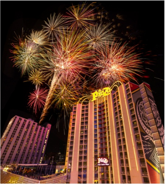 The fireworks shot from the Plaza’s towers will be visible to the thousands of tourists and locals in downtown Las Vegas and miles beyond. Plaza hotel guests will be able to enjoy the fireworks from an exclusive viewing party on its rooftop pool deck, where the fireworks will be “ignited” by a special guest for hotel guests starts at 7 p.m. and will feature a DJ, photo opportunities, and drink specials.