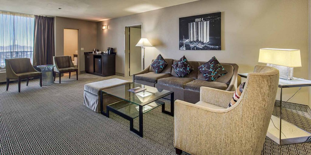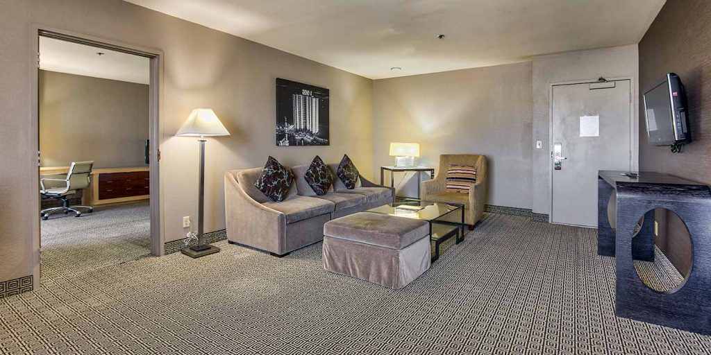 Our one bedroom suites (approximately 650 square feet) come with a living room parlor, a total of 1.5 bathrooms, in-room safe, multiple flat-screen televisions with premium cable channels, mini refrigerator, coffee maker, wet bar and all of our deluxe room amenities. Each bed features luxury bedding with fresh and crisp triple sheeting and select pillows.